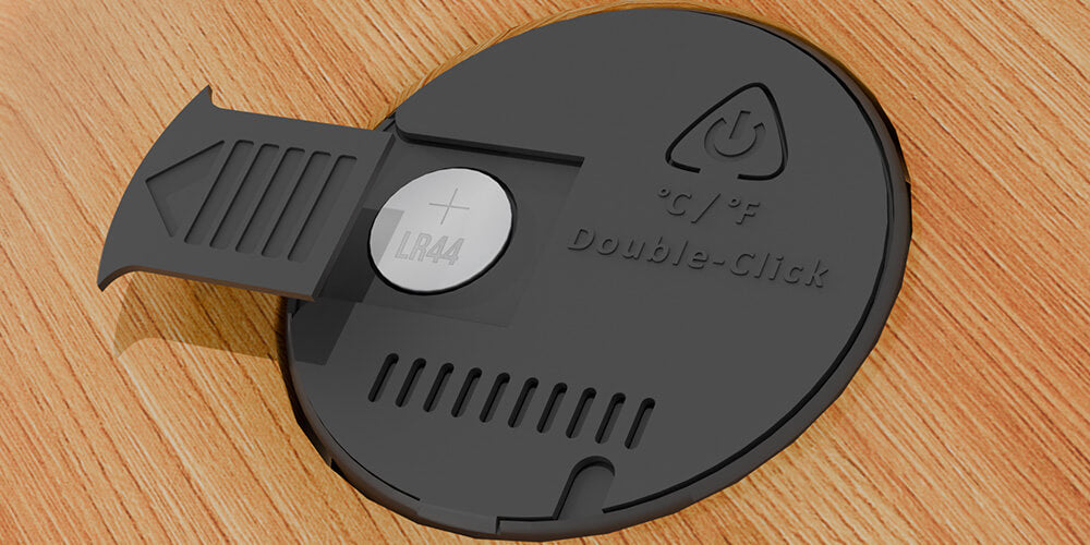 To replace the battery, open the battery door on the back of the display unit and insert a new LR44 battery with the correct polarity.