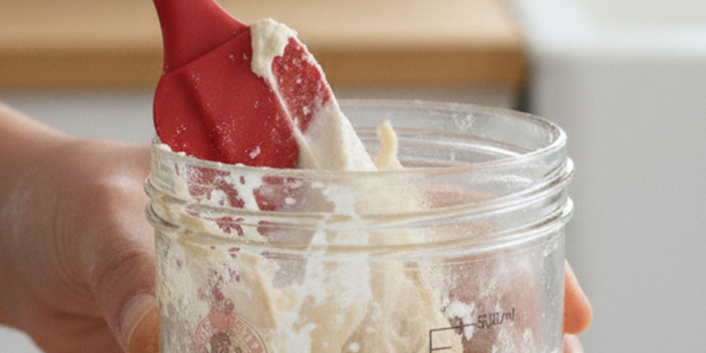 - Combine 80 grams of water and 60 grams of whole-wheat flour in the jar.